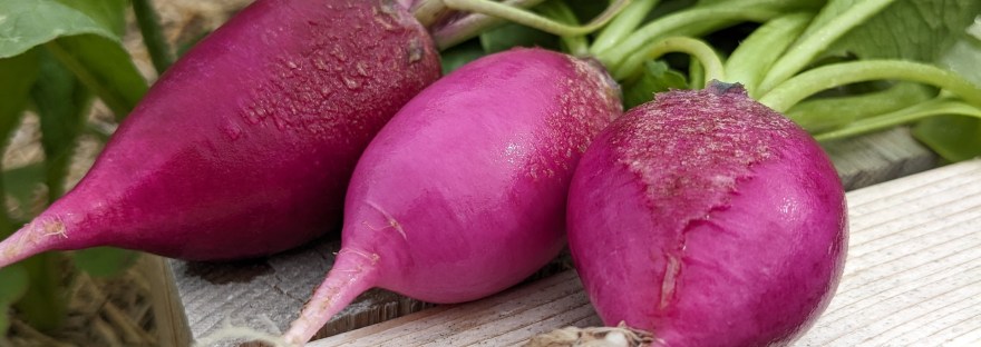 For my first harvest from the garden, I got to try these radishes this week. They grew quite a bit bigger than I was intending, as they really weren't ready the last time I checked them -- apparently they grow faster than I thought! These were supposed to be a sweeter variety, but they definitely… Continue reading A Radish Harvest and a Recipe to Try